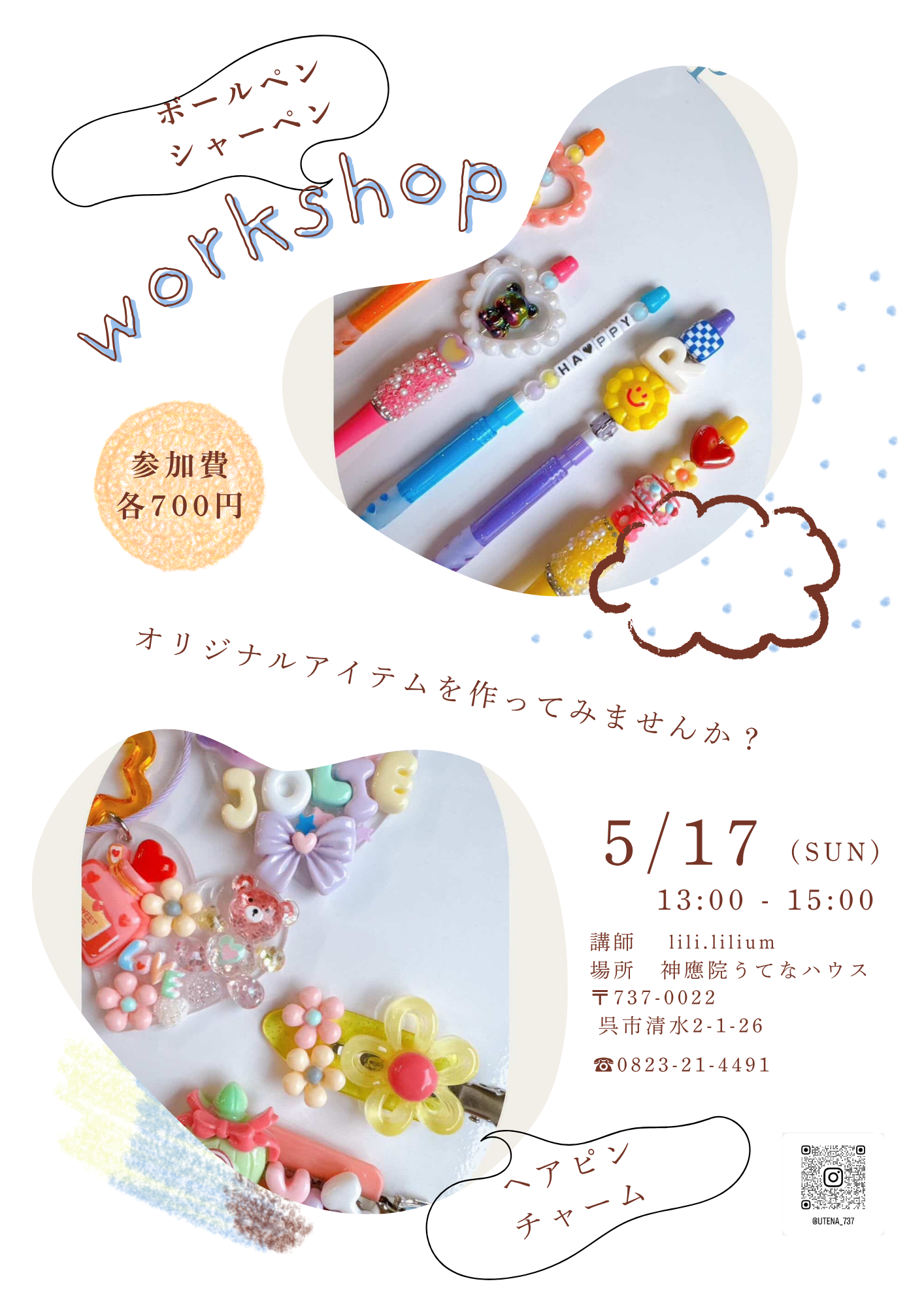 4月の花まつりマルシェに出店して下さるlili.liliumさんのワークショップを 5月17日㈰うてなハウスで行ないます。 大人も、子どもも、お気に入りのパーツでワクワクしながら オリジナルのアクセサリーを作ってみましょう。