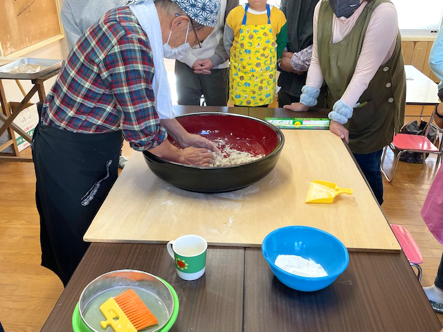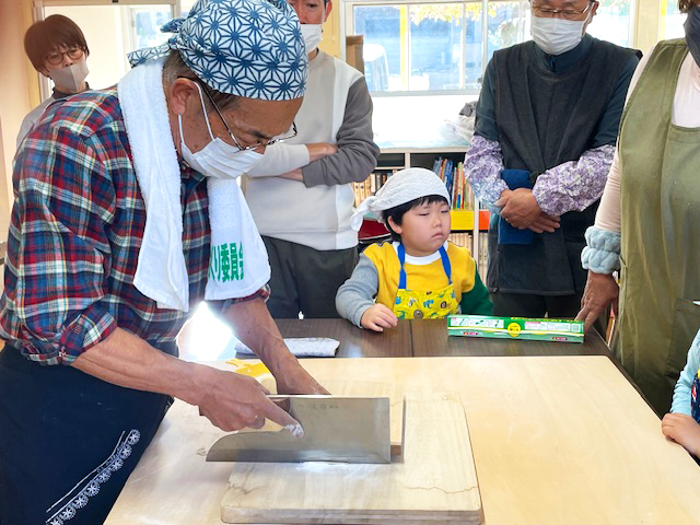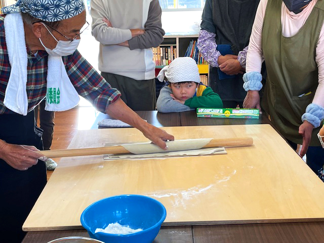 参加者も実際に、蕎麦を伸ばしたり、切ってみたり体験もして頂きます。